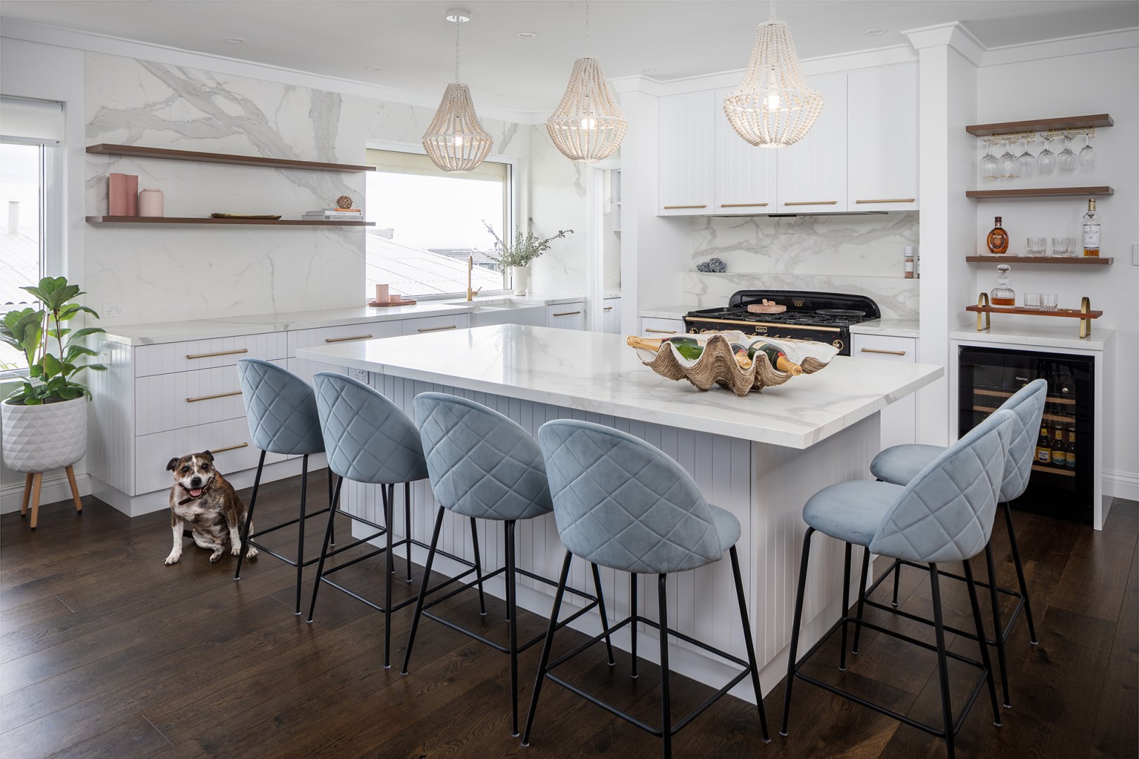 The kitchen was a large part of this renovation where the clients wanted a space that truly was the heart of the home, where the family would spend most of their time, to eat, entertaining, to work and relaxing. The design utilises the full room, repurposing unused space for a workable area or storage. In the centre of the kitchen is a large island bench that features white V Groove panelling.
