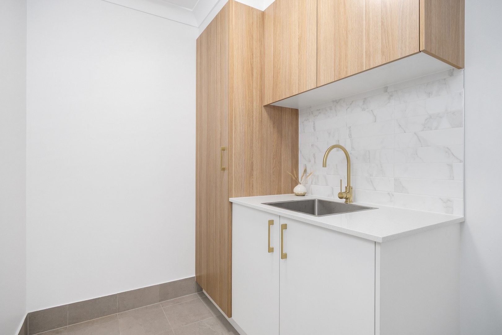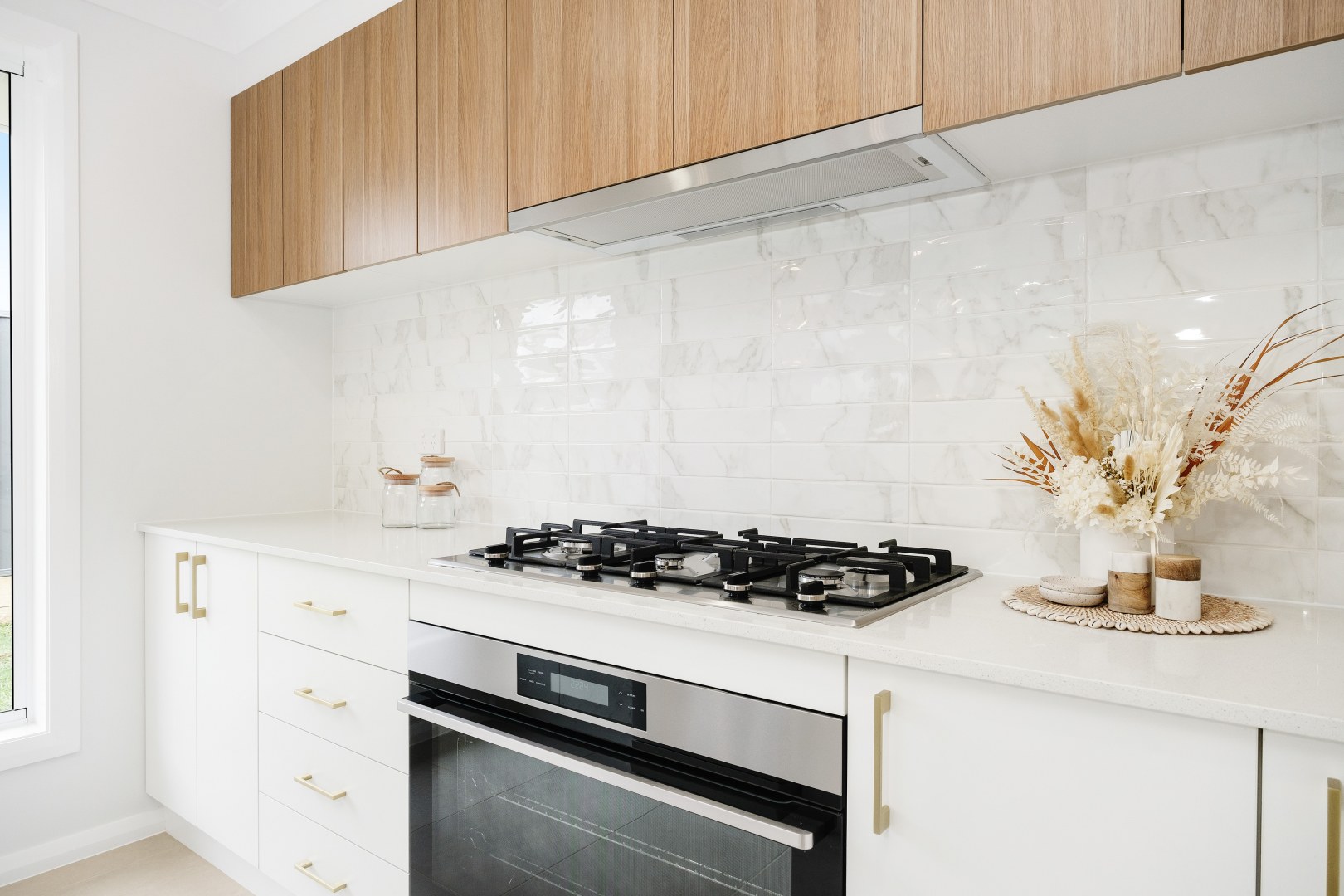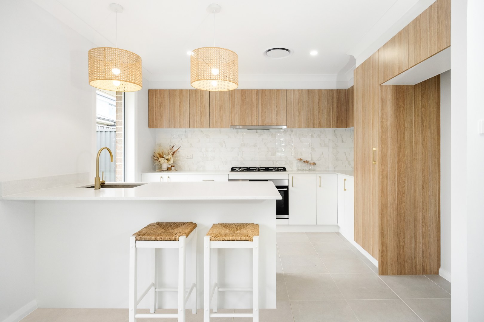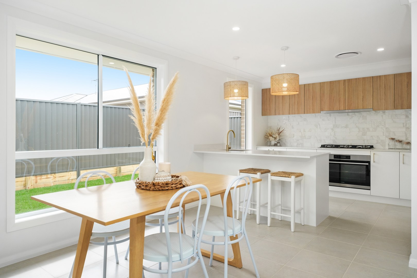 Our 'Olivea' design is a 3 bedroom home with an open plan Kitchen, Living and Dining. Being a speculative build (build to sell) Varroview Homes chose to do a light and bright two tone Kitchen using polytec cabinetry to create a relaxed, Coastal vibe with brushed brass as an accent.
