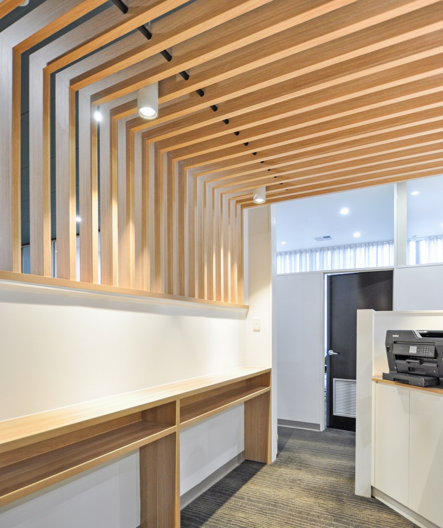 This was a renovation of an existing office space to bring our clients warmth, colour and texture. This was achieved by using Steccawood in Natural Oak Ravine and Blossom White throughout the space. Steccawood was used as a ceiling feature and partition to the copy area which brought texture and life to an otherwise forgotten space. We also utilised Steccawood on the rear feature wall to the boardroom and to the directors desk to create a point of difference.