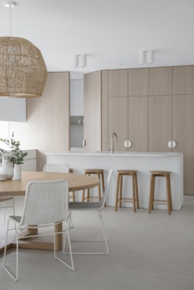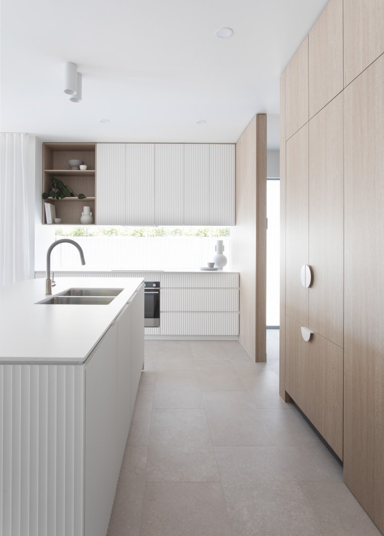 Located in Paradise Point on the Gold Coast, this home embraces Contemporary Coastal design and features. The combination of Coastal Oak Woodmatt and custom Thermolaminated panelled doors in Classic White Matt ensure a timeless colour palette incorporating both warmth and pattern. All cabinetry runs floor to ceiling to maximise storage and create clean lines; and appliances, pantries and storage are hidden behind doors to keep practical elements out of sight.