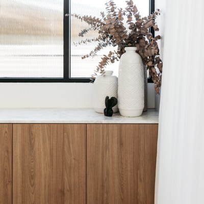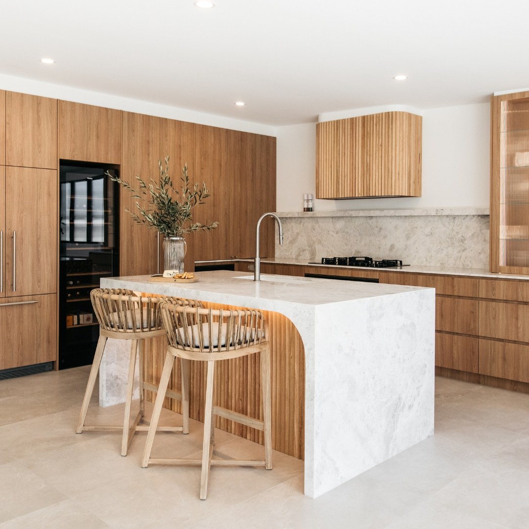 The warm tones and textures of the polytec Tasmanian Oak cabinetry and natural stone bench tops combine to make this kitchen the heart of this beautiful home. The integrated appliances seamlessly blend into the cabinetry, creating a harmonious and streamlined look. The fridge, dishwasher and appliance zone are thoughtfully concealed, allowing the cabinetry to take center stage creating a sense of timeless elegance.
