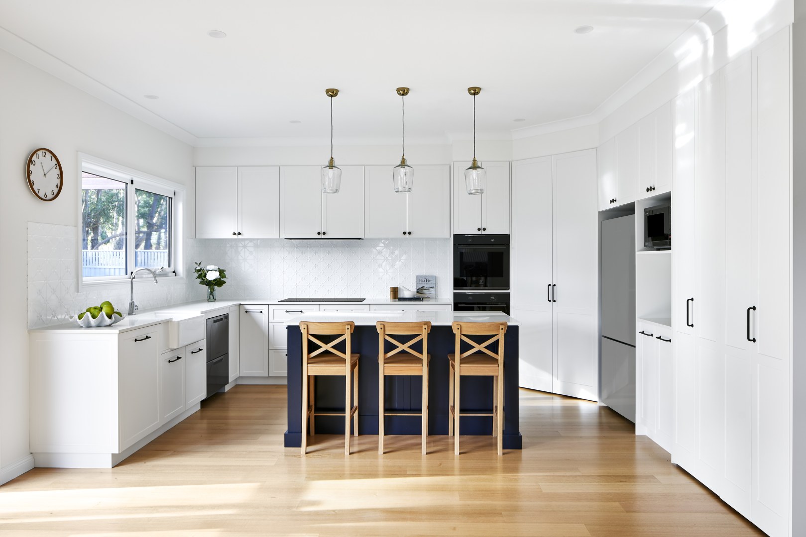 Working alongside the client we created a warm and inviting home with a traditional design style. In keeping with our clients love of classic homes we selected a neutral colour palette adding in some bold features, such as the beautiful detailed Oxford navy island bench and vanities in both the main bathroom and ensuite. The kitchen truly is the heart of this home, with stunning classic features, plenty of natural light and a spacious layout adjoining the dining and living zones.