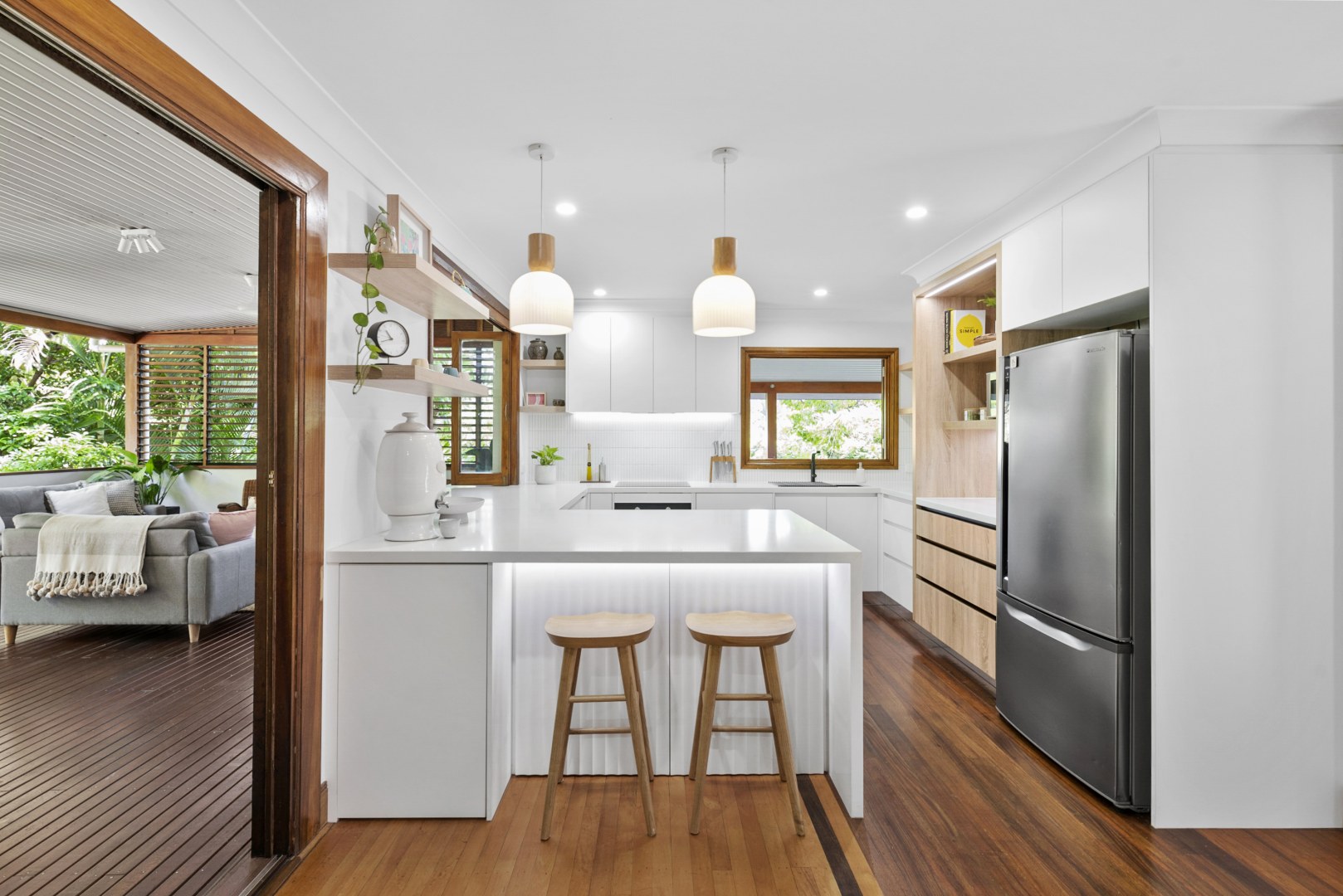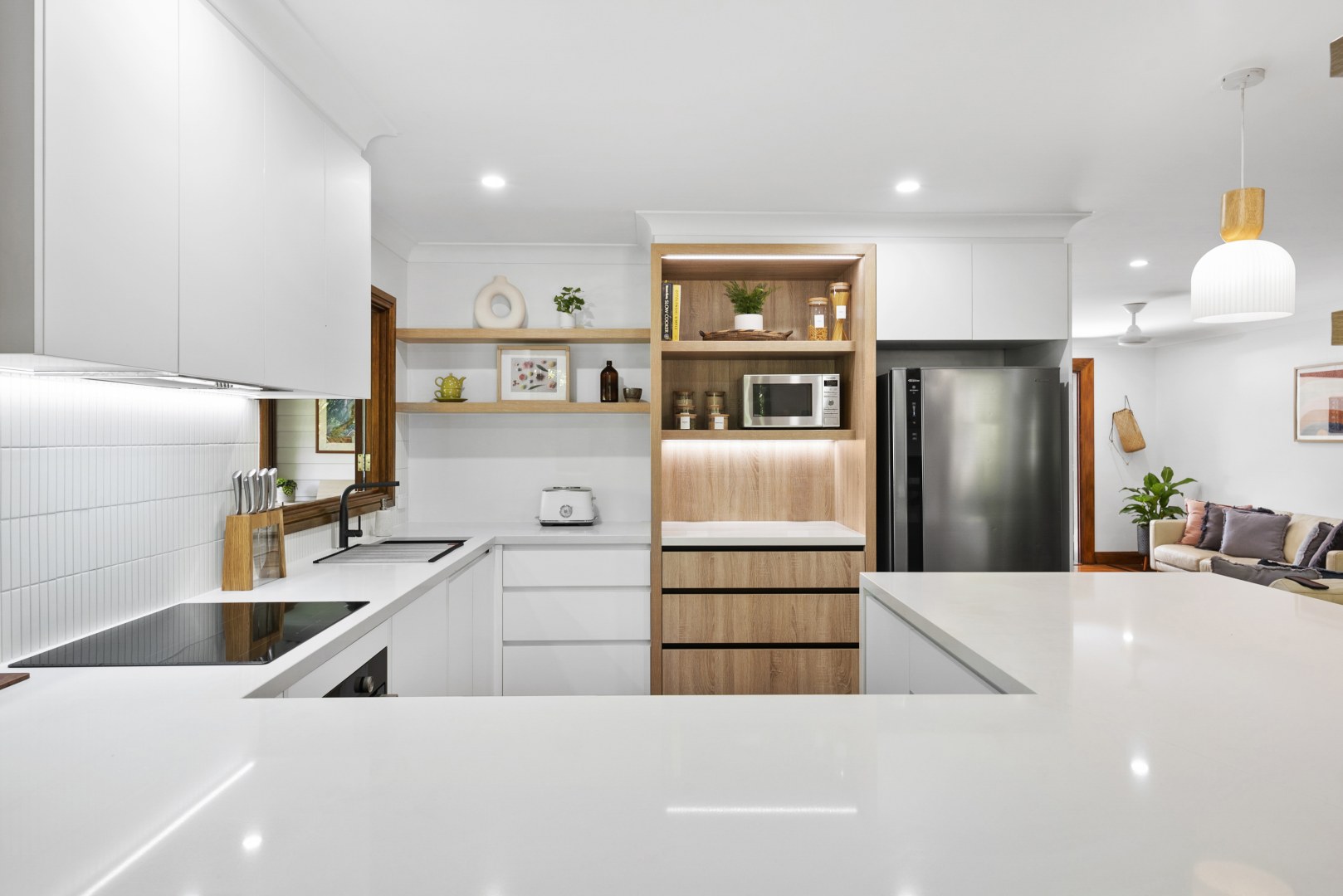 Benfer kitchen has been meticulously designed to fulfil the client's brief for clean lines and simplicity. Paying homage to the classic style of the Tropical Queenslander design, this design seamlessly blends coloured tones to harmonize with the existing house decor. The cabinetry featured in White Ultramatt exudes a modern and fresh appeal. The attention to detail is evident in the subtle under bench panel feature using White Ultramatt Cove 50 Fluted profile doors to create a textured finish.