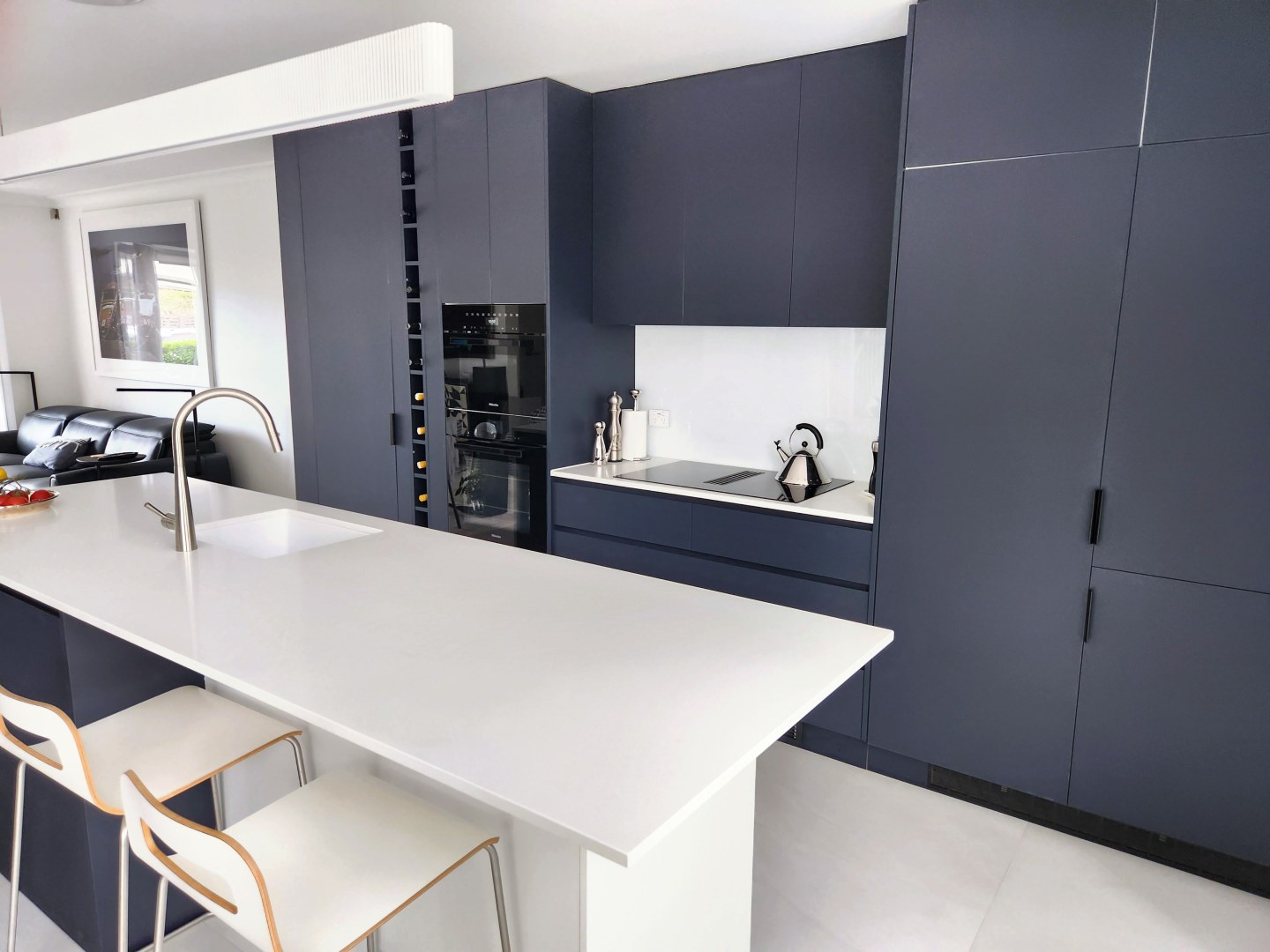 My client asked me for help as I had done work for them before. They had been flooded in 2022, so took the opportunity to update their living room and kitchen. They liked a streamlined look with no fuss. They used Venette Oxford Matt and Blossom White with Stone Ambassador Benchtop in Pearl White but were not interested in a textured timber feature. The splashback is Stegbar white glass and the handles are Allegra matt black. Appliances are Miele. I prepared concept drawings in Sketch Up.