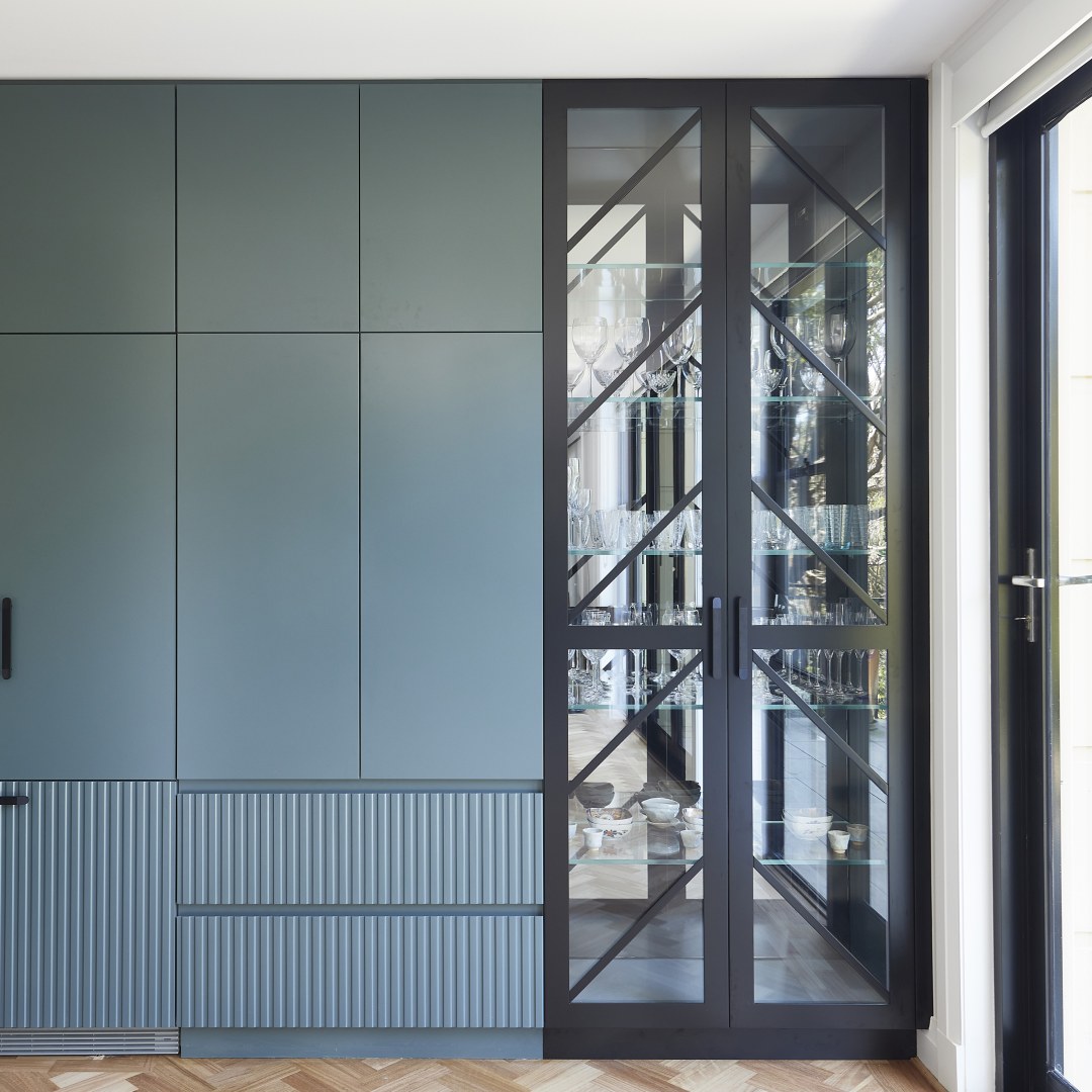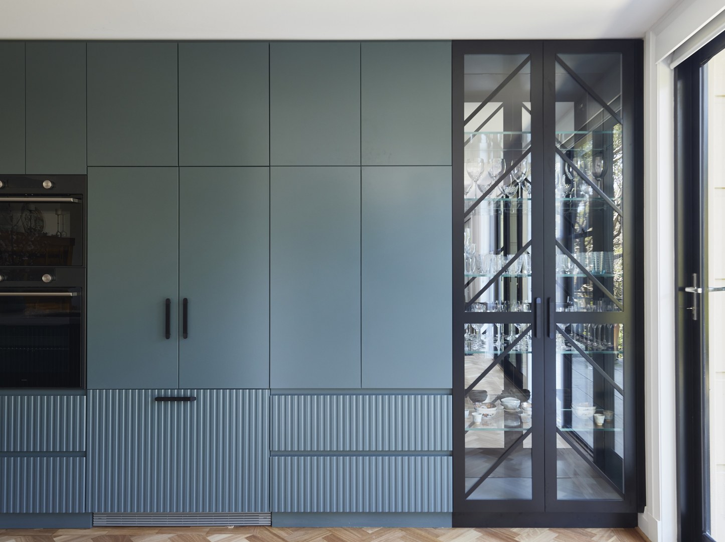 Our client had recently purchased this spacious townhouse in Wollstonecraft with an expansive leafy outlook. The brief was to create a contemporary but warm home with greens and timbers to reference it's location. Here we used the Bari door profile in a polyurethane spray paired with Chateau Oak overhead cupboards