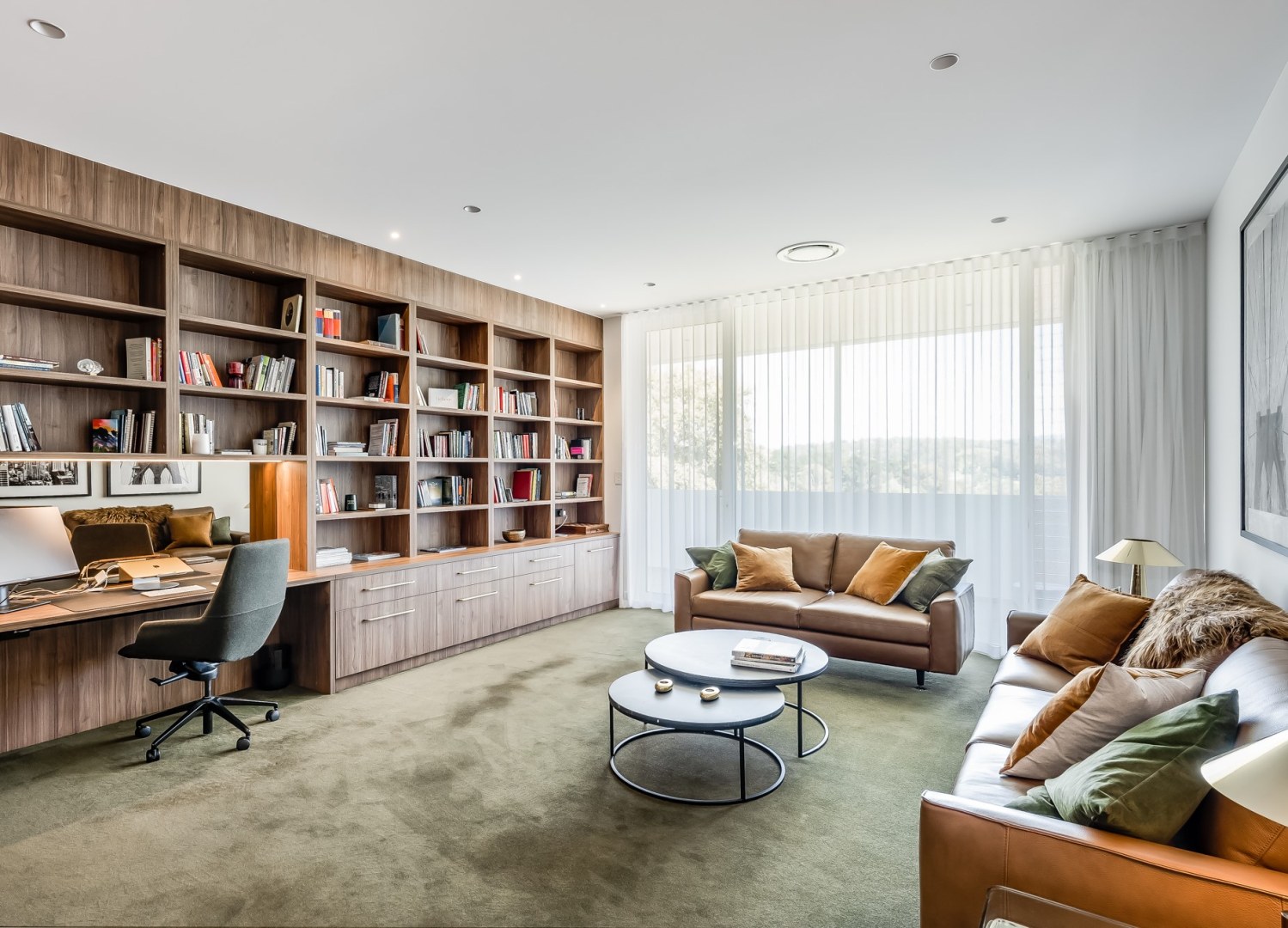 polytec Notaio Walnut features throughout this Adelaide Hills property, from the beautiful kitchen & butler's pantry to the luxurious walk in wardrobe and stunning bathrooms; the gorgeous tiles further enhanced against the Notaio Walnut joinery units. Even the laundry was not forgotten, and a nod to mid century styling is apparent in the den; its opulent olive velour carpet the perfect pairing with Notaio Walnut built in cabinetry. Notaio Walnut was the perfect choice for this superb property.