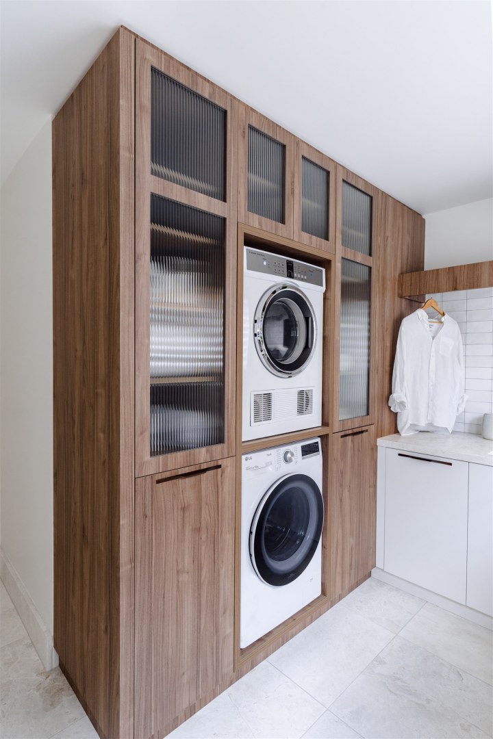 This renovation shows us that Laundries can be beautiful: looking like a 5 star hotel, but also have all the function that a modern family needs. We were working with the existing parameters of the space, but we wanted to add functionality to this zone. From a practical standpoint, we have included pull out hampers and a Magic Corner storage system so that the dead space is now able to be utilised. The floor and benchtop is in Arctic Ice Natural Stone and the cabinetry in Notaio Walnut Woodmatt.