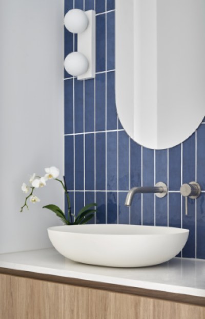 Neutral materiality and natural earthy tones of Polytec's Woodmatt Prime Oak used across the custom joinery within our Delmont Avenue project, delivers a warm welcoming feel to this custom built home. With the addition of green and blue vertical subway tiles in the Ensuite and Powder Room, this pop of colour combined with the Prime Oak joinery creates a beautiful designer statement.