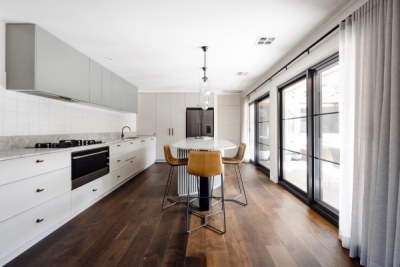 This is a special project as it is one of our directors own homes. To design a kitchen space for a growing family was a labor of love but also a challenge especially around the time of lock downs and restrictions. The material palette needed to give contrast to soft white walls but still provide a strong statement which is delivered by the island bench with it's 3dimensional curved shape.
