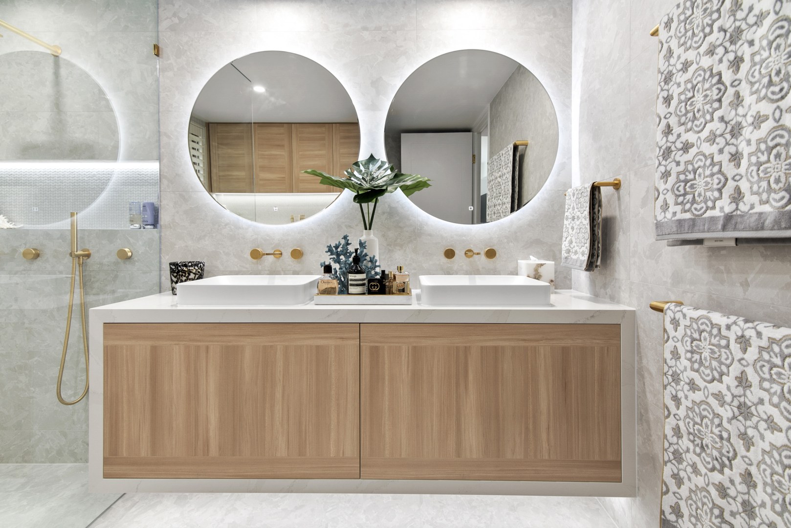 Full renovation of high end Apartment at Palm Cove Far Nth Qld Polytec Plantation Ash Woodmatt used extensively as a feature colour in various forms. Feature Shadowline's and Carcasses in the Kitchen Avellino Doors on the Vanities and Bar Custom Steccawood panelling in the Bar and Linen/Storage with hidden doors. Plantation Ash was the perfect blend with the stunning herring bone natural timber floors and Silestone Calacatta Gold Benchtops.