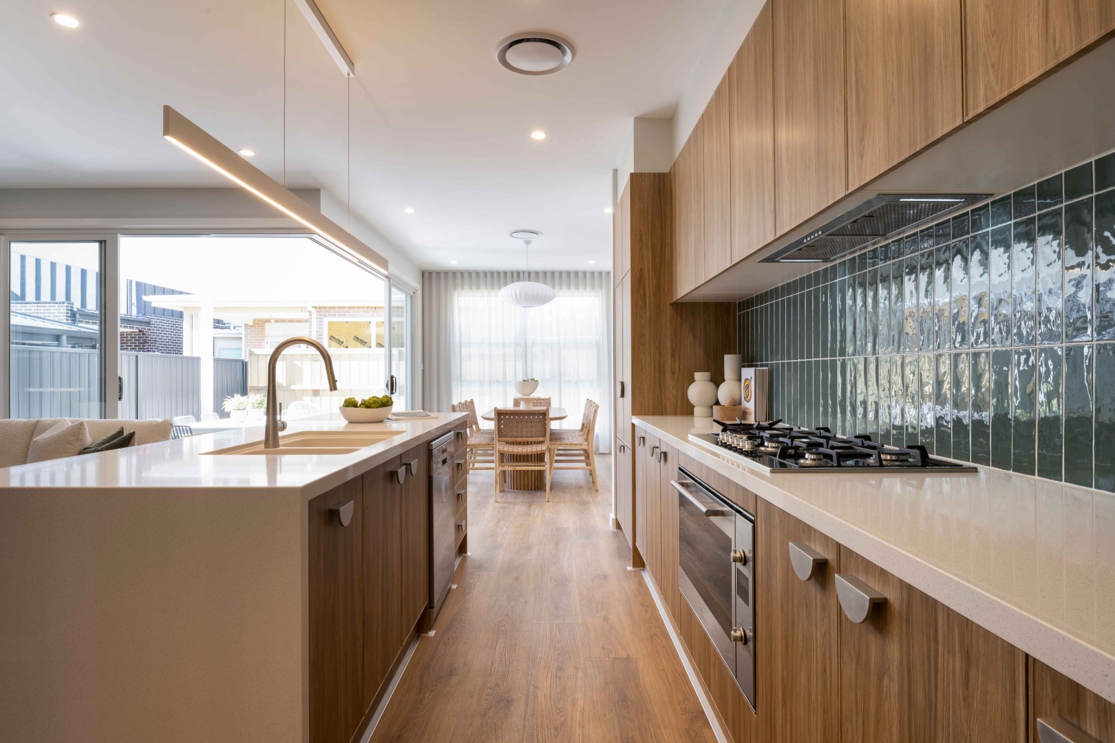 The Avoca 206 showcases retro hues, angled textures and contemporary curves define Shaynna Blaze’s brand new funky ‘Mid Century Retro’ Signature Collection theme. We have achieved this look and feel in the joinery by using polytec's Prime Oak in a Woodmatt finish with the Chifley profile to all cabinetry which really complements the accent retro green tiles in the kitchen. Also adding texture to the Home Theatre using Prime Oak Steccawood as a feature which frames the TV and adds a warmth.