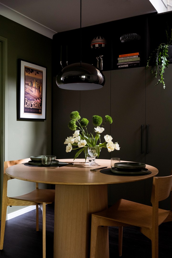 Nestled in a leafy suburb of Brisbane this townhouse transformation maximises use of a small space. With only 45sqm for kitchen, dining, and living the design effectively packs a lot of functionality into a hard working kitchen that also doubles as a stylish, tranquil living and entertaining space. The design is centred around a stunning natural granite island bench and continuous wall of joinery that connects the kitchen, drinks bar, entertainment unit and bookcase in one seamless transition.