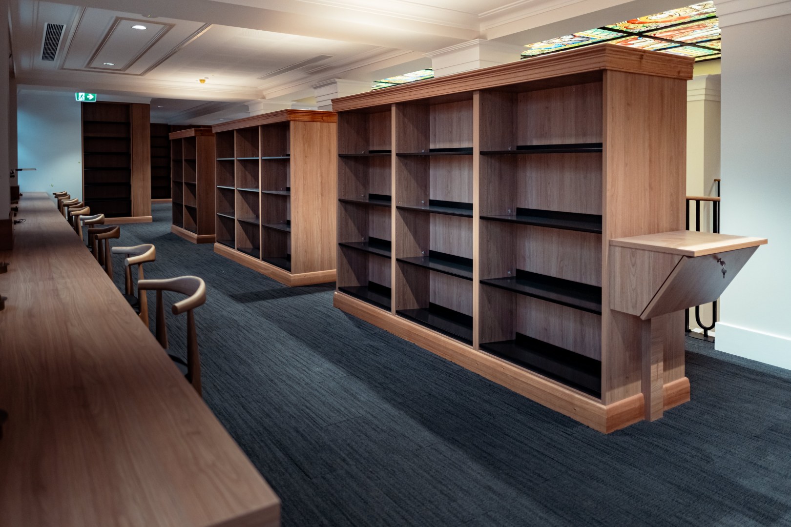The Campion College in Toongabbie Sydney received funding to construct a new Library space and worked with WMK Architecture and Reitsma to design and construct this project. IntraSpace was approached by Project Strategies (the Project Managing company) to assist them with the supply and installation of the Library Shelving and Seating. We took the initial concept render and the architectural plans and brought the project to life with prototypes and samples and final design work. Our manufacturing division Buro Interiors manufactured all the joinery and the complete bespoke shelving project was installed in full and on time. The materials used were polytec Tasmanian Oak with real Tasmanian Oak timber mouldings.