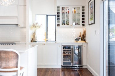 This 1960's cottage has been revamped and modernised into a trendy modern day Hamptons house. Featuring polytec's Thermolaminated 'Classic White' in the Hamptons profile with the federation profile capping mould also on display. The touches of gold accessories really bring out the veining in the Silestone benchtops that add to the class of this project.