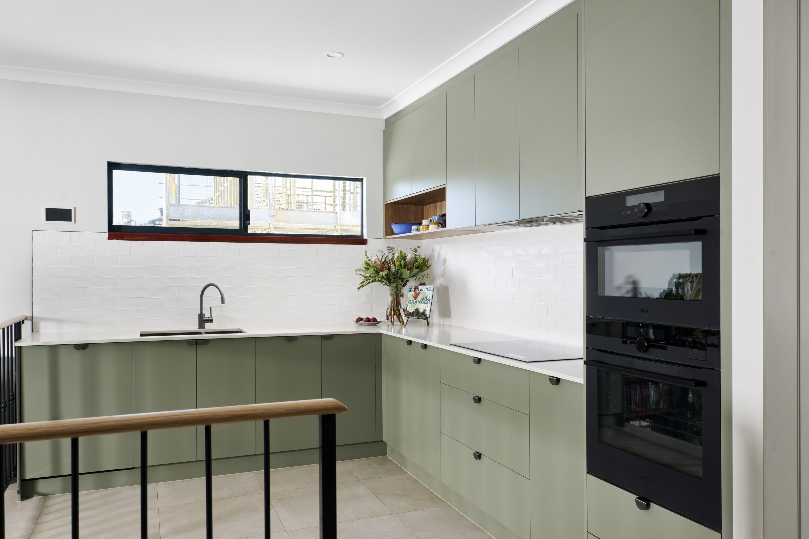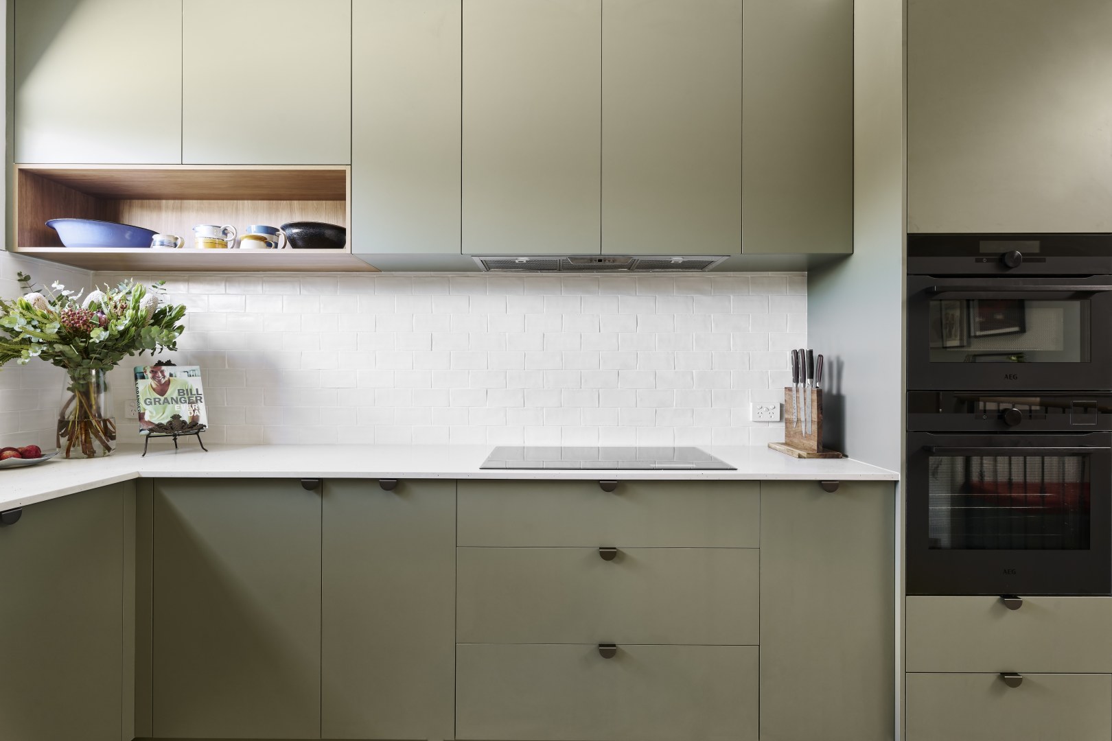 Renovation of kitchen and dining space over split site in older home maximising storage and bench space.