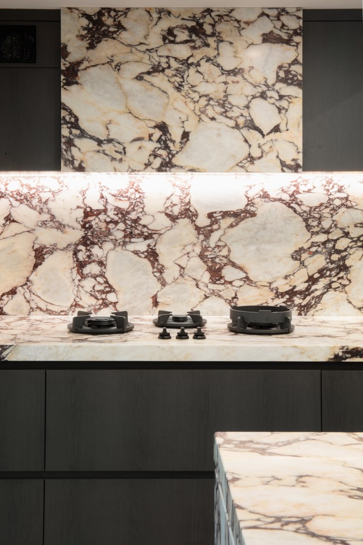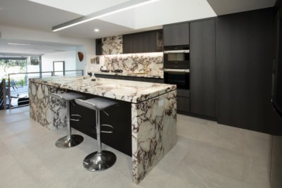 The space was a complete renovation, although due to the flooring it needed to fit at least over the original footprint. The client let the designer have free reign with the design and colour choice - her only request was that the space be used to make a bold statement. To do this the designer contrasted polytec's dramatically dark Empire Oak Woodmatt beautifully with the stunning Calacatta honed Viola benchtops and splashback. This along with the clever inclusion of the Pitt cooktop is superb!
