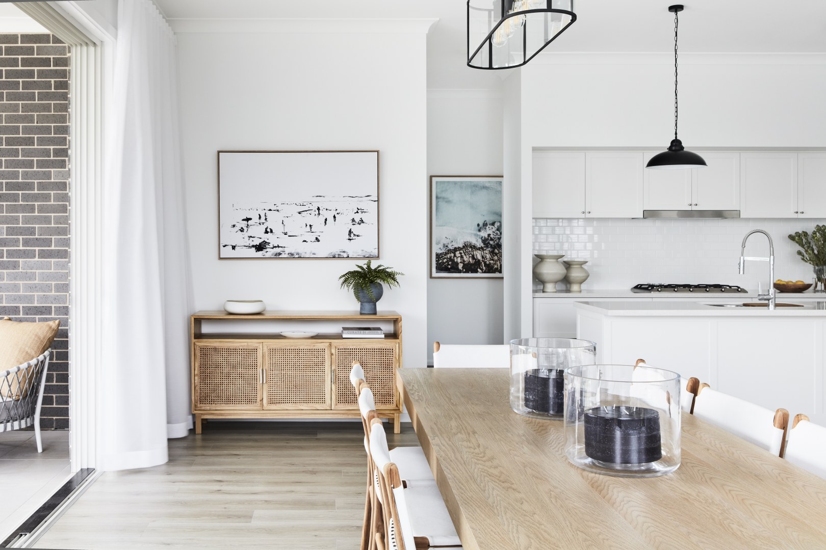 The concept for this home was a relaxed beach house, which evokes a sense of calm and tranquillity as soon as you enter. The colours and materials consist of bright white, navy, sea-green, oak timber, rattan, and soft grey. polytec's Classic White Matt perfectly complements this clean, crisp ambience.
