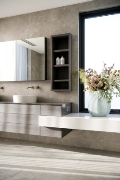 A narrow lot residence set upon a green leafy street in Perth’s west, this project called for sophisticated elegance whilst maintaining a softness and neutrality. Havana Oak Woodmatt and Canterbury Grey Matt were the perfect combination for the homes cabinetry finishes, both being subtle in tone and structure whilst contrasting with the softly veined benchtops. Soft curves on the kitchen peninsula add a sleek touch to the clean lines of the overall design.
