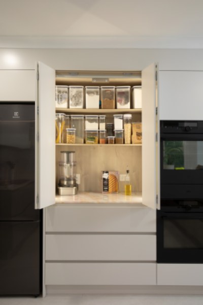 This kitchen makeover highlights polytec's Angora Oak Woodmatt board, skillfully integrated into the island's battening and displayed in the appliance centre, adding warmth to white cupboards. Drawers in the same Oak offer a stunning contrast against the stone and white cabinetry. Luxurious Rose Quartzite countertops further elevate the space with natural elegance. Immerse yourself in a harmonious fusion of contemporary design and timeless sophistication in this culinary haven.
