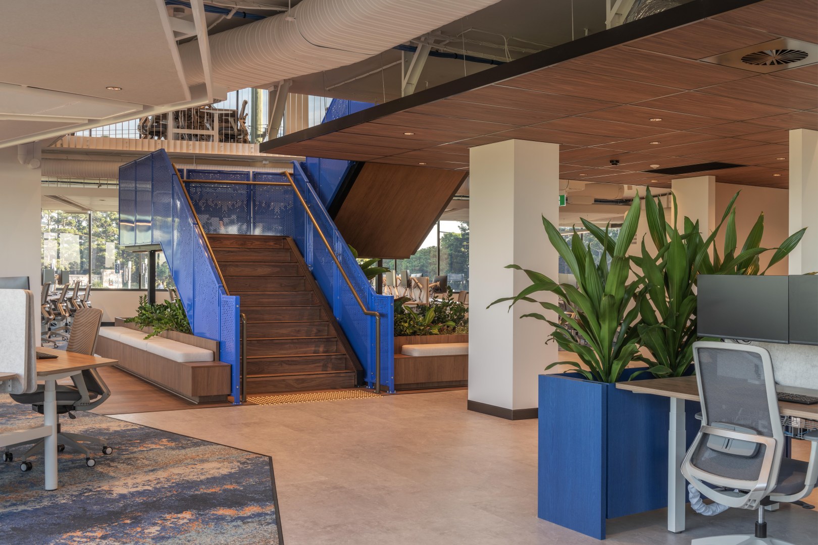 Unity Water’s new HQ is a bold reinvention of Corporate Identity and Brand, manifesting their cultural values into the physical space. The colour palette is inspired by the Morton bay regions waterways and gave us an exciting opportunity to have fun with finishes. The blue of the Aegean Oak was an exciting choice embraced by the client. The fun blues and oranges throughout are hugged by the warm and refined embrace of the Florentine Walnut.