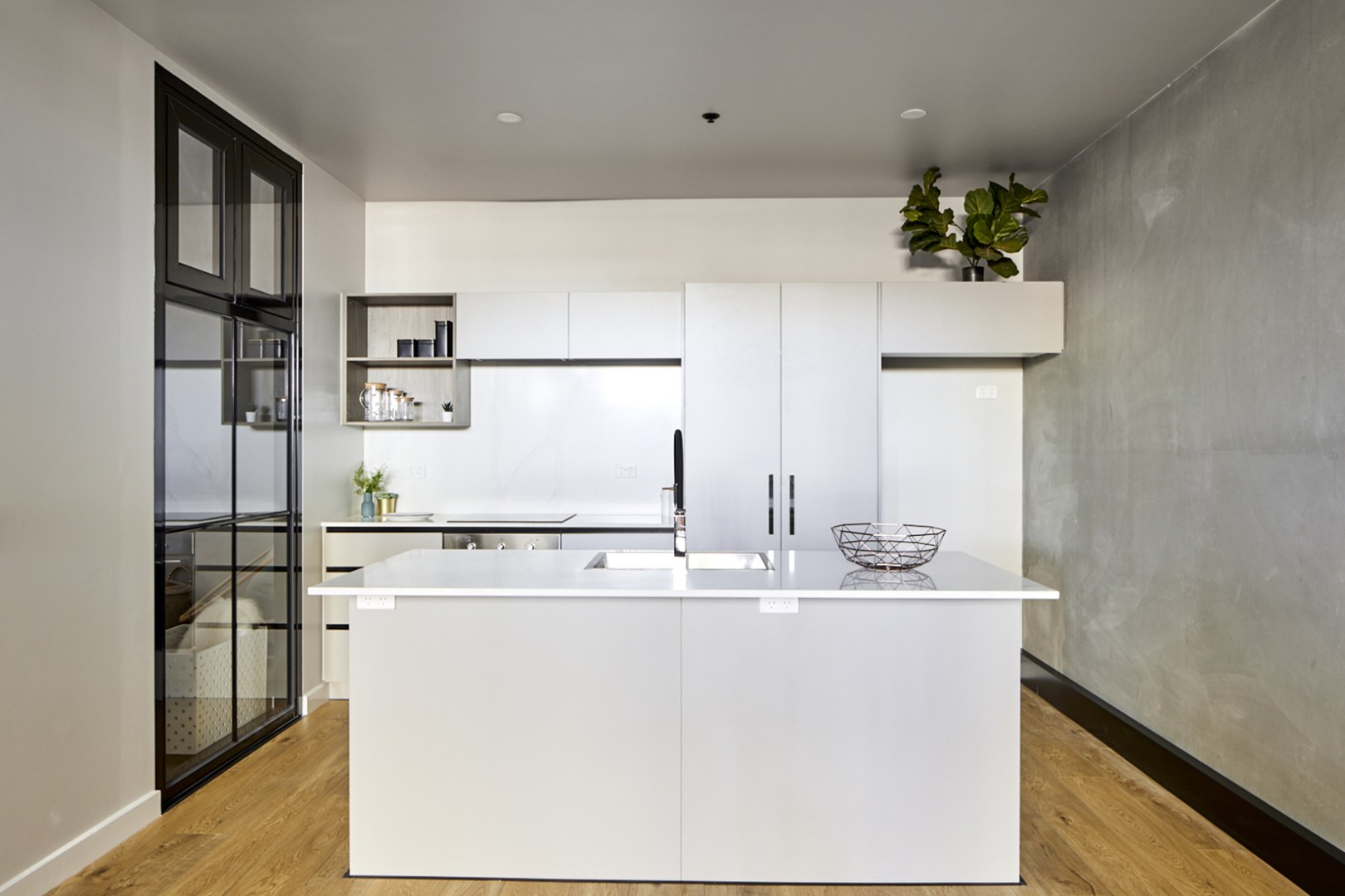 A bold step to create an unconventional, yet familiar design in a prominent location. Polytec played a significant role in fusing the industrial New York style interior to the bold red brick exterior, two colour schemes were used Stone Grey Matt and Black Matt. Colours paid homage to the natural materials and added a heighted level of luxury to the development. Each bathroom had a custom-made circular mirror cabinet.